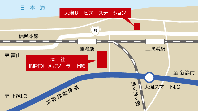 INPEXマークのサービス・ステーションではその石油製品を販売しています。 サービス・ステーションへの供給のほか、新潟県や長野県、富山県に位置する工場や工事現場、ホテルの暖房などに使用する石油製品を、地場販売店を通じて供給しています。 エネルギーの安定供給を使命に、日々石油製品の販売活動を行って参ります。
