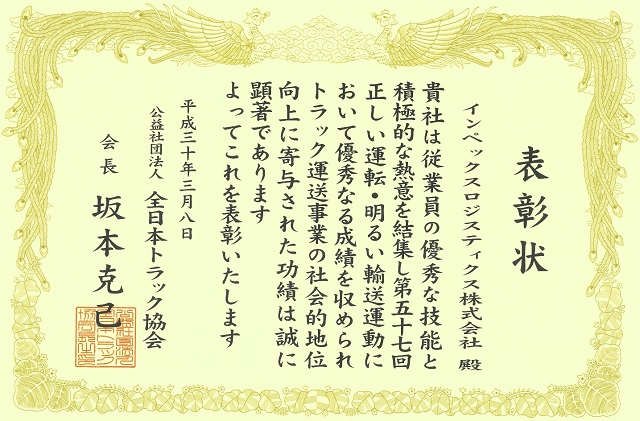 (社)全日本トラック協会が年末年始の交通事故防止活動の一環として例年実施している「正しい運転・明るい輸送運動」において、下記の実施項目に対する当社の取組が評価され、平成30年3月8日付で同協会より表彰されました。