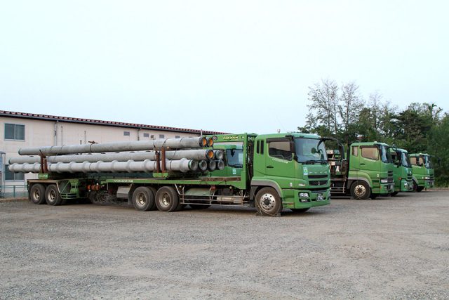 貨物輸送部門は、小型クレーン付トラックや大型トレーラーによる掘削資機材、土木建設資材などの長大重量物の輸送を行っています。